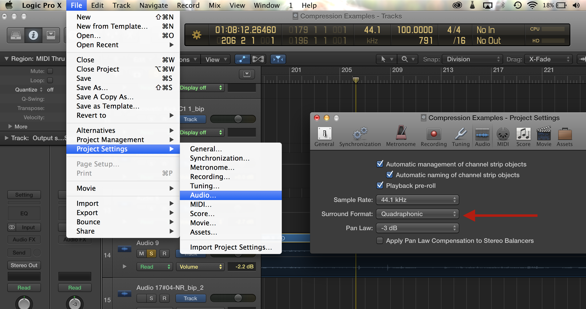 • File -> Project Settings -> Audio -> Surround Format (for 618, choose Quadraphonic)