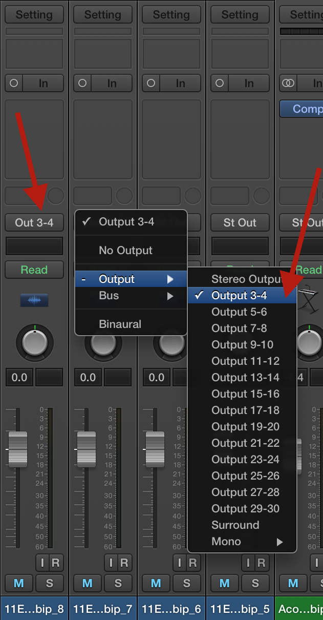 • Each track can be assigned a specific pair of outputs on the interface. To use the rear speakers in 618, select "Output 3-4" on one of your tracks: