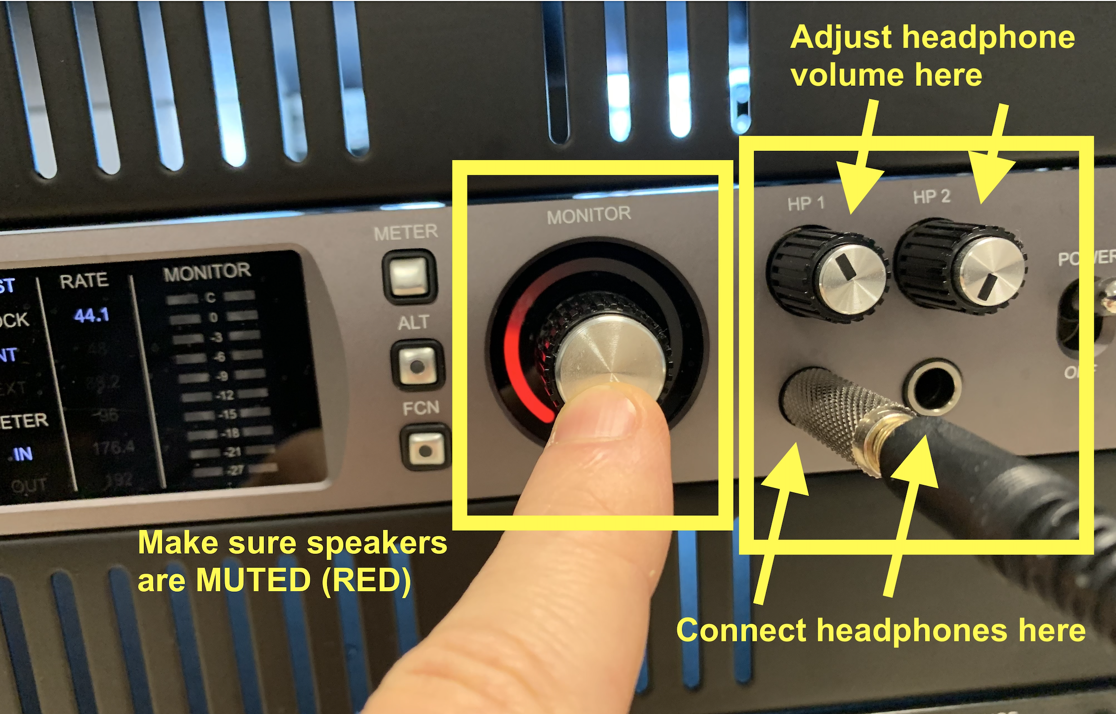 6- Make sure the speakers are muted (push the "Monitor" dial on the Apollo so that it turns RED).
