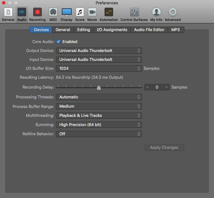 5- In logic, go to the preferences -> Audio -> devices, and make sure "Universal Audio Thunderbolt" as the Input and Output device (this is Logic's name for the Apollo X8).